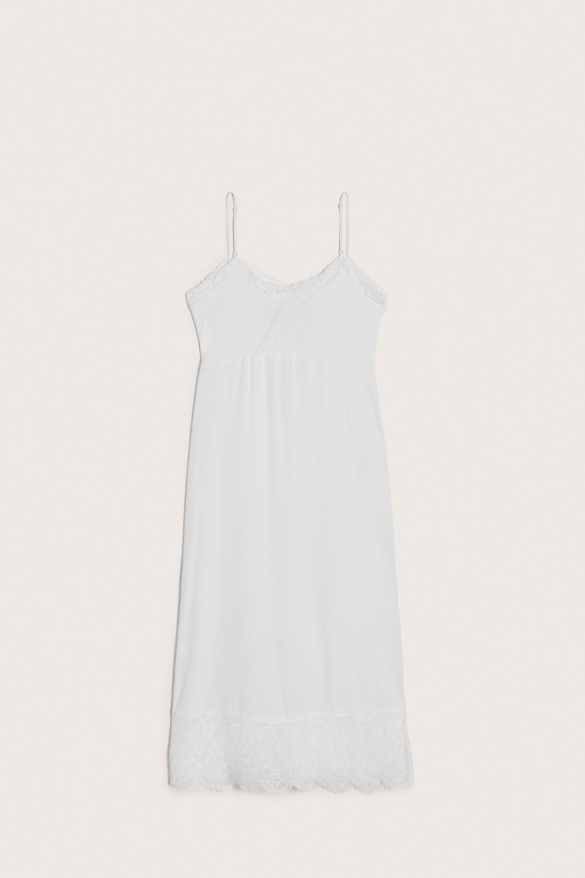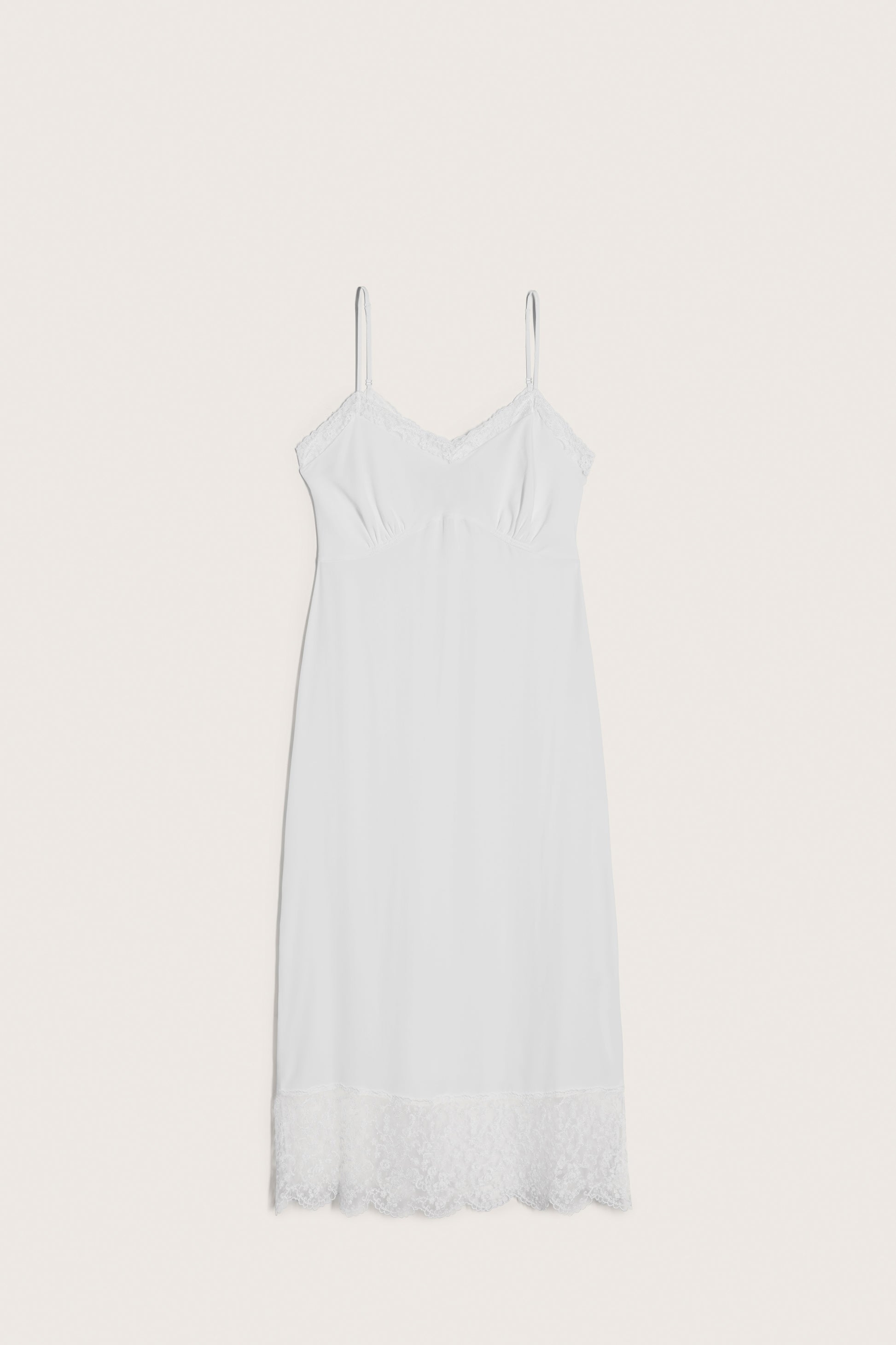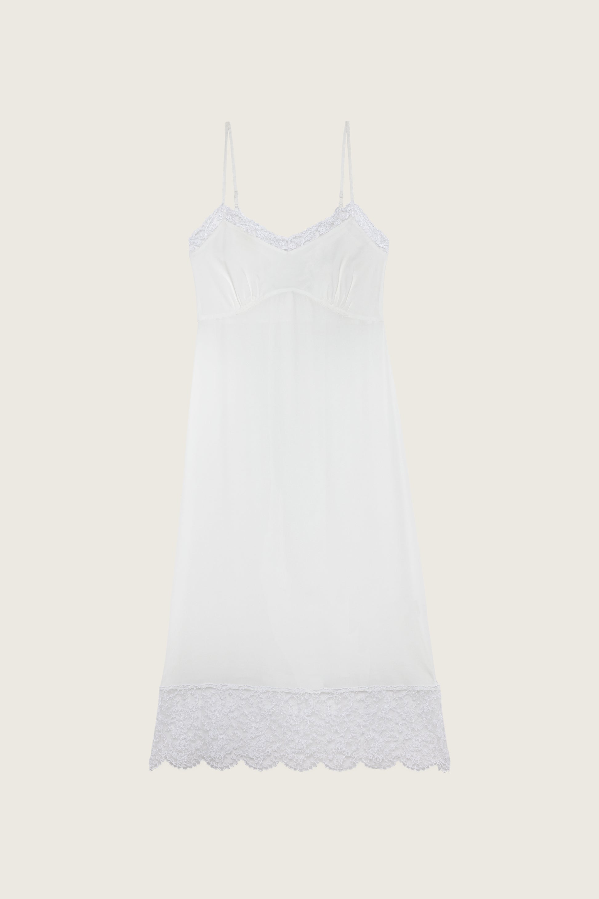 A slip dress made in a silk mix crepe de chine, a classic style from the brand. Featuring a seasonal floral embroidered lace trim and adjustable straps, the perfect layering piece to be worn under our tulle dresses.