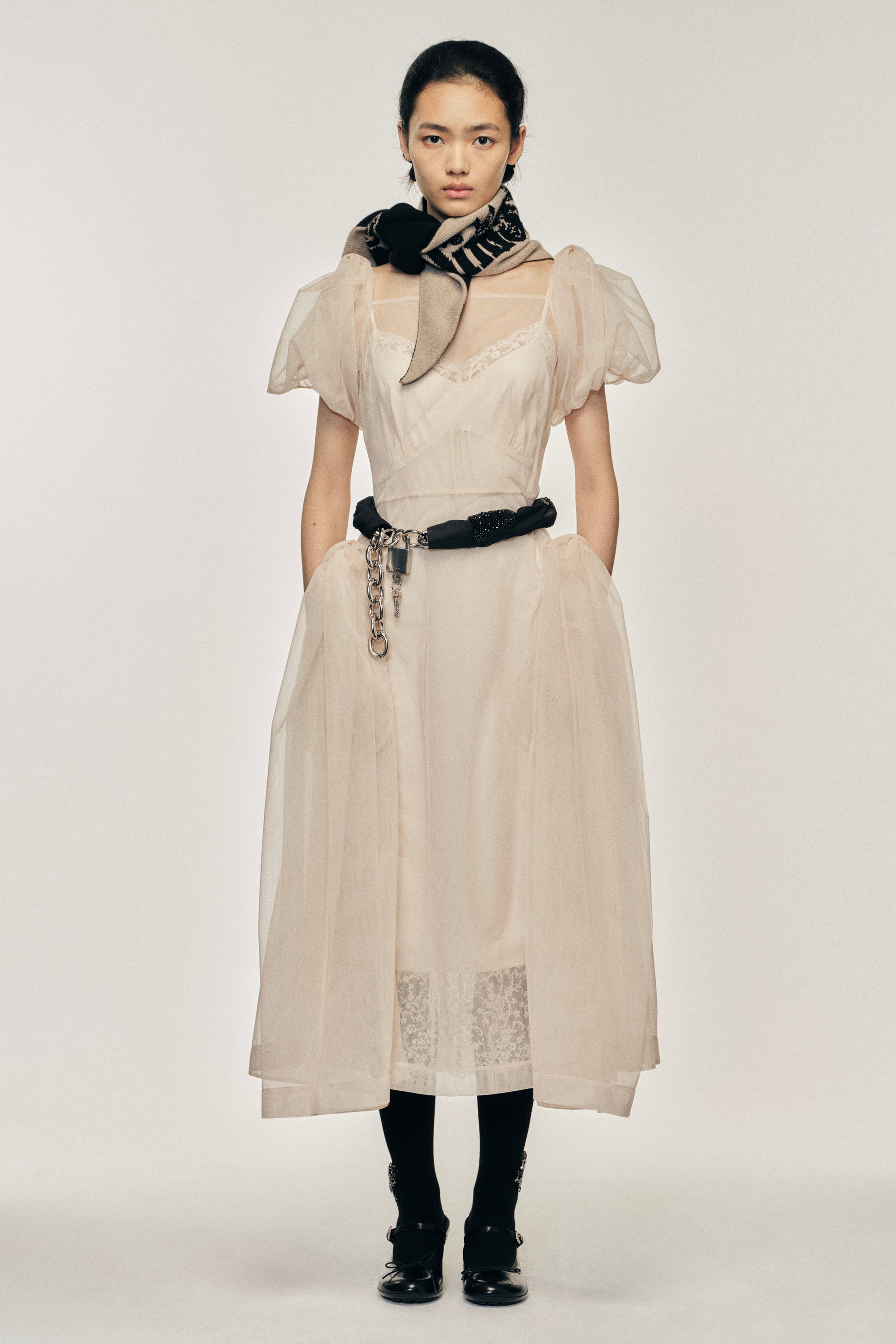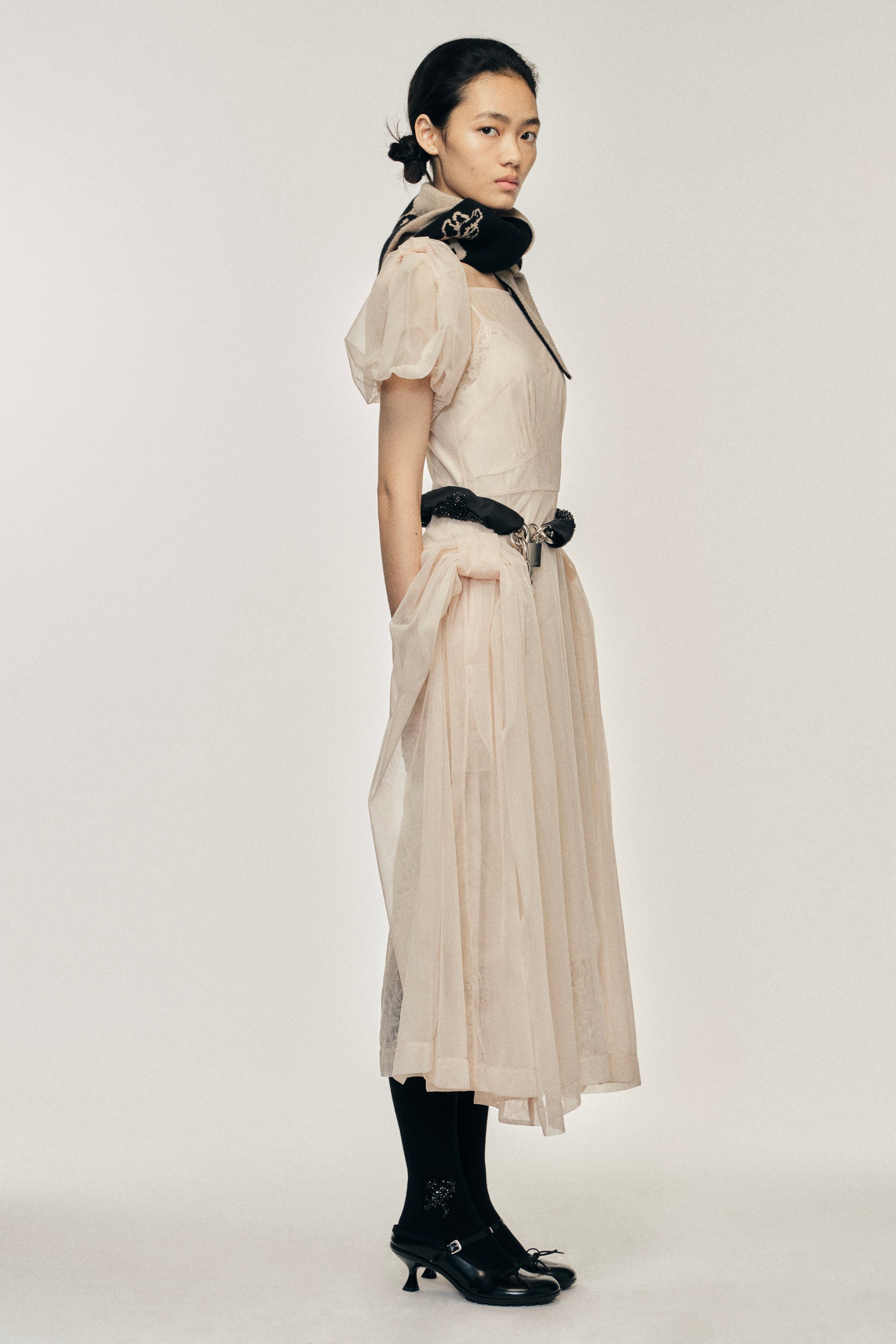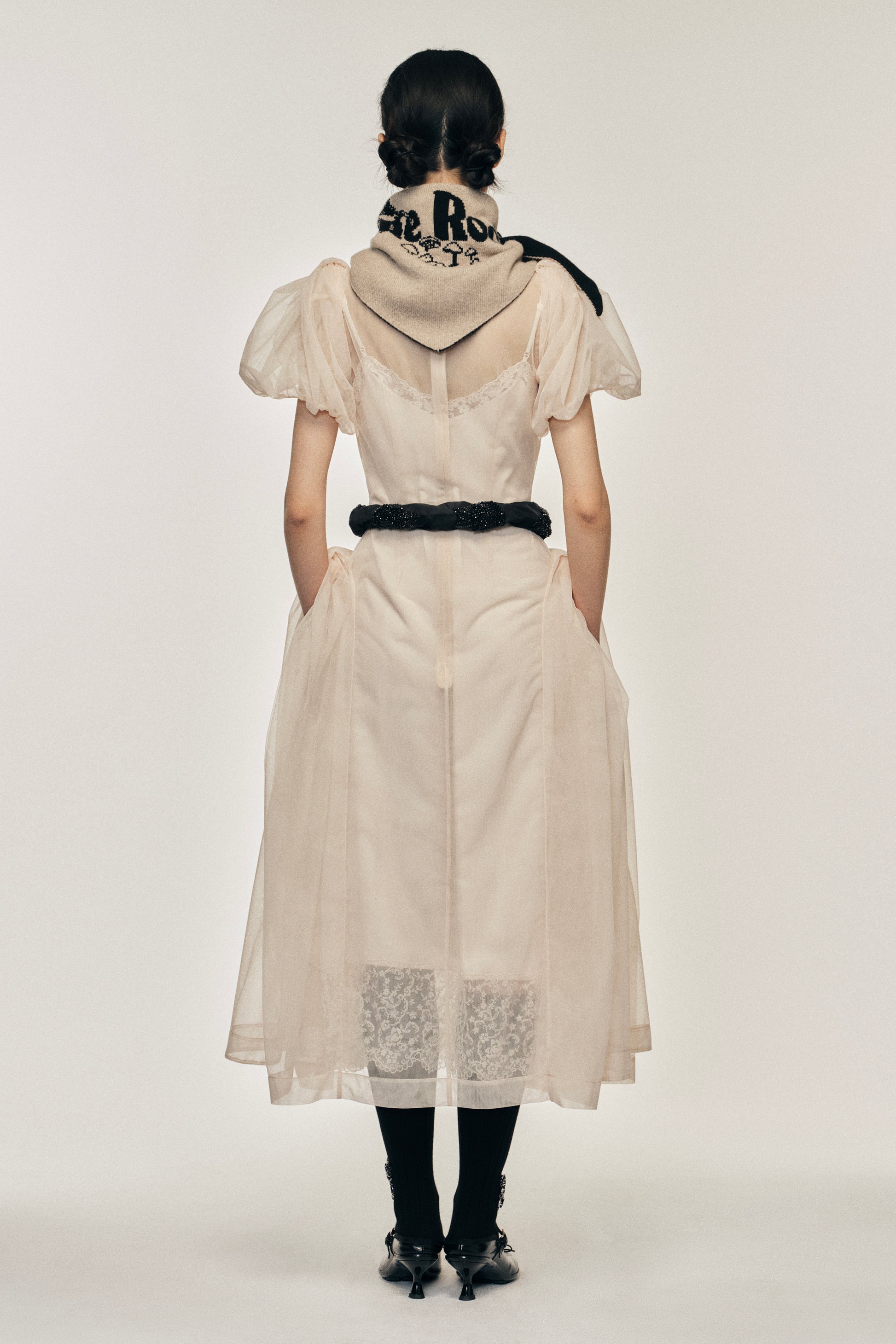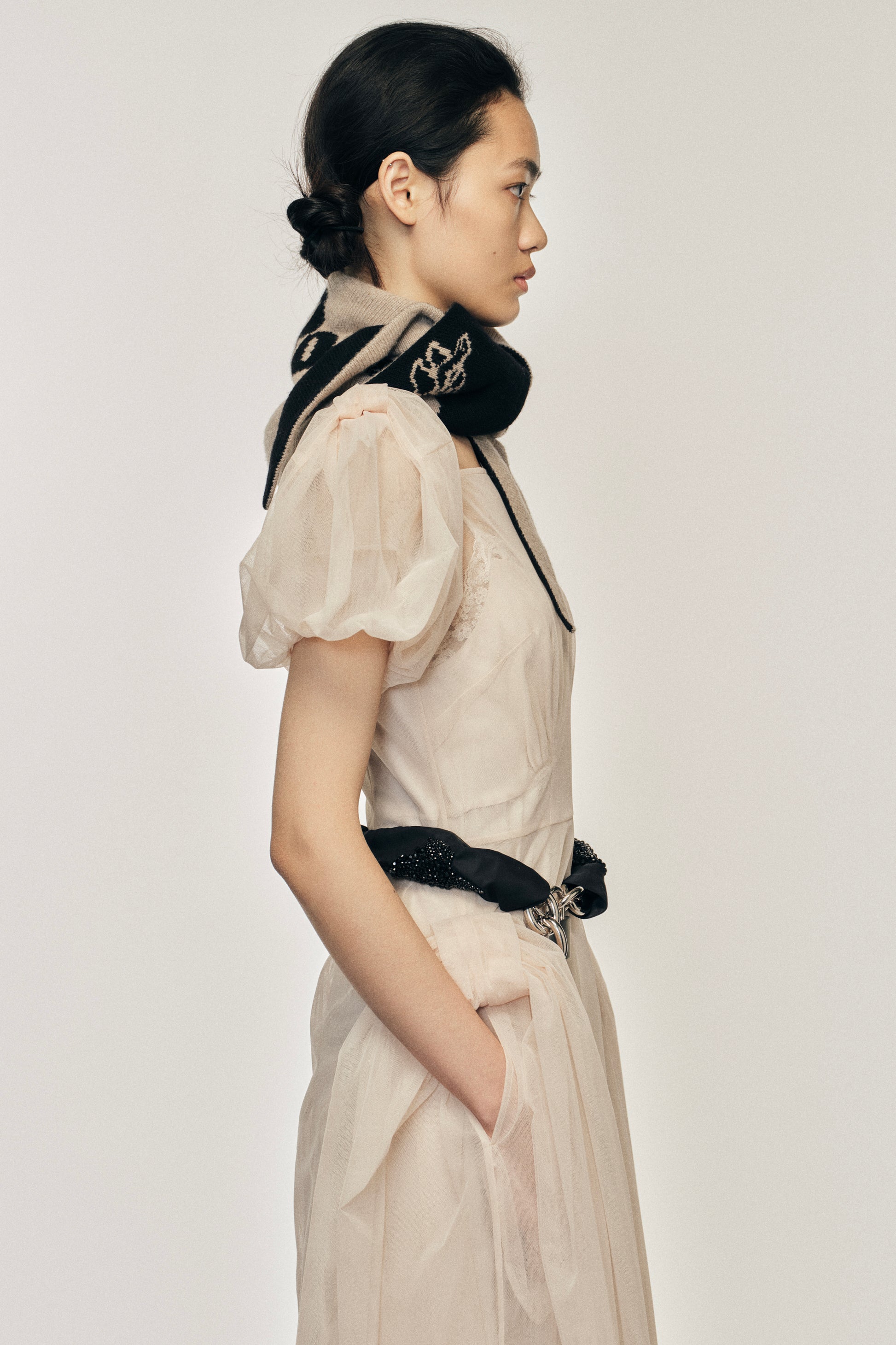 A signature Simone Rocha dress with a puff sleeve and voluminous skirt, it is updated with a square neckline and there are self bow details at the shoulder and hip. The model is wearing this style with the Graphic Logo Knit Neckerchief & Embellished Sleeve Chain Padlock Belt.