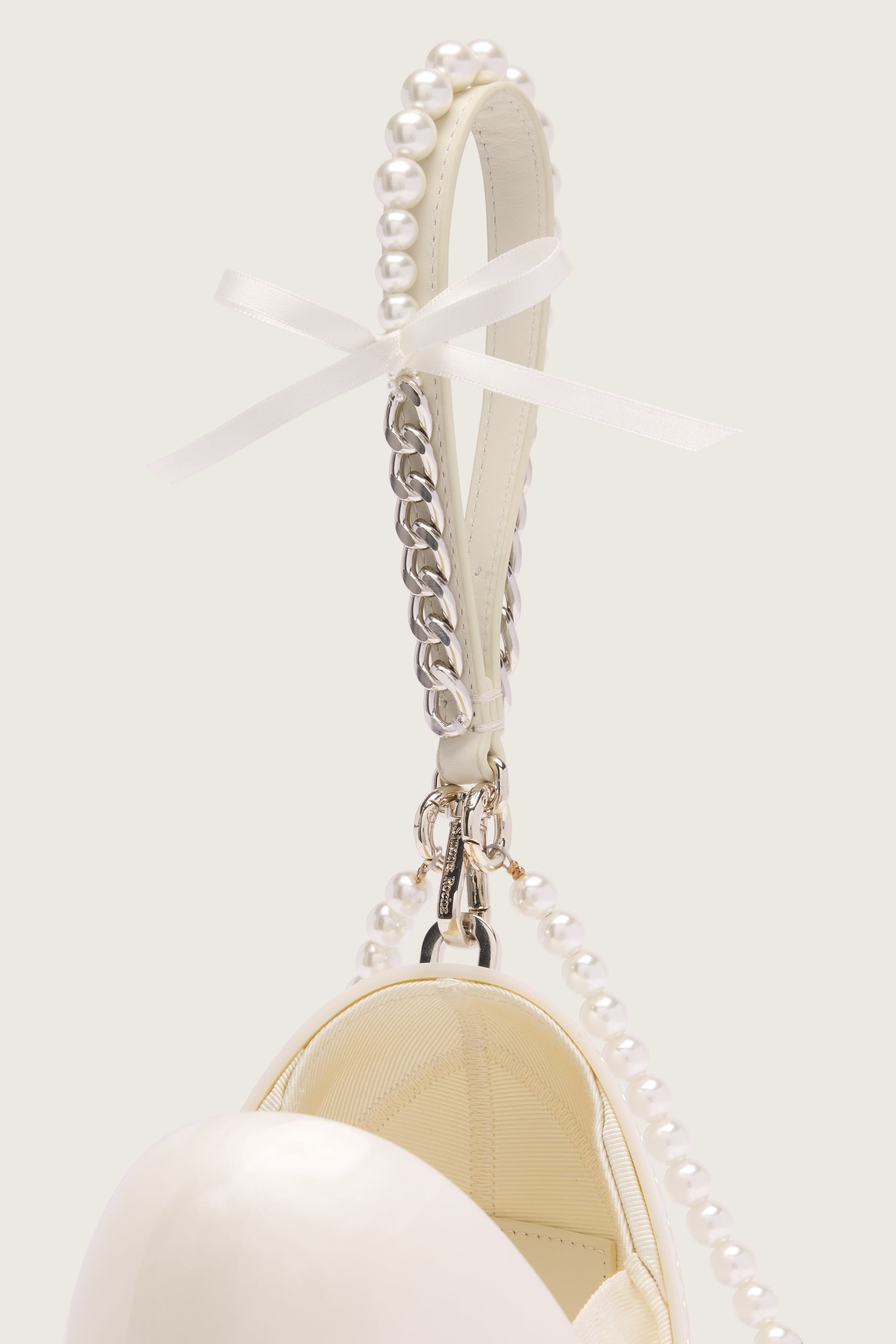 The classic pearl egg bag is adorned with this season's pearl and chain detail at the leather wristlet. It also has a detachable pearl strap for an additional signature touch.