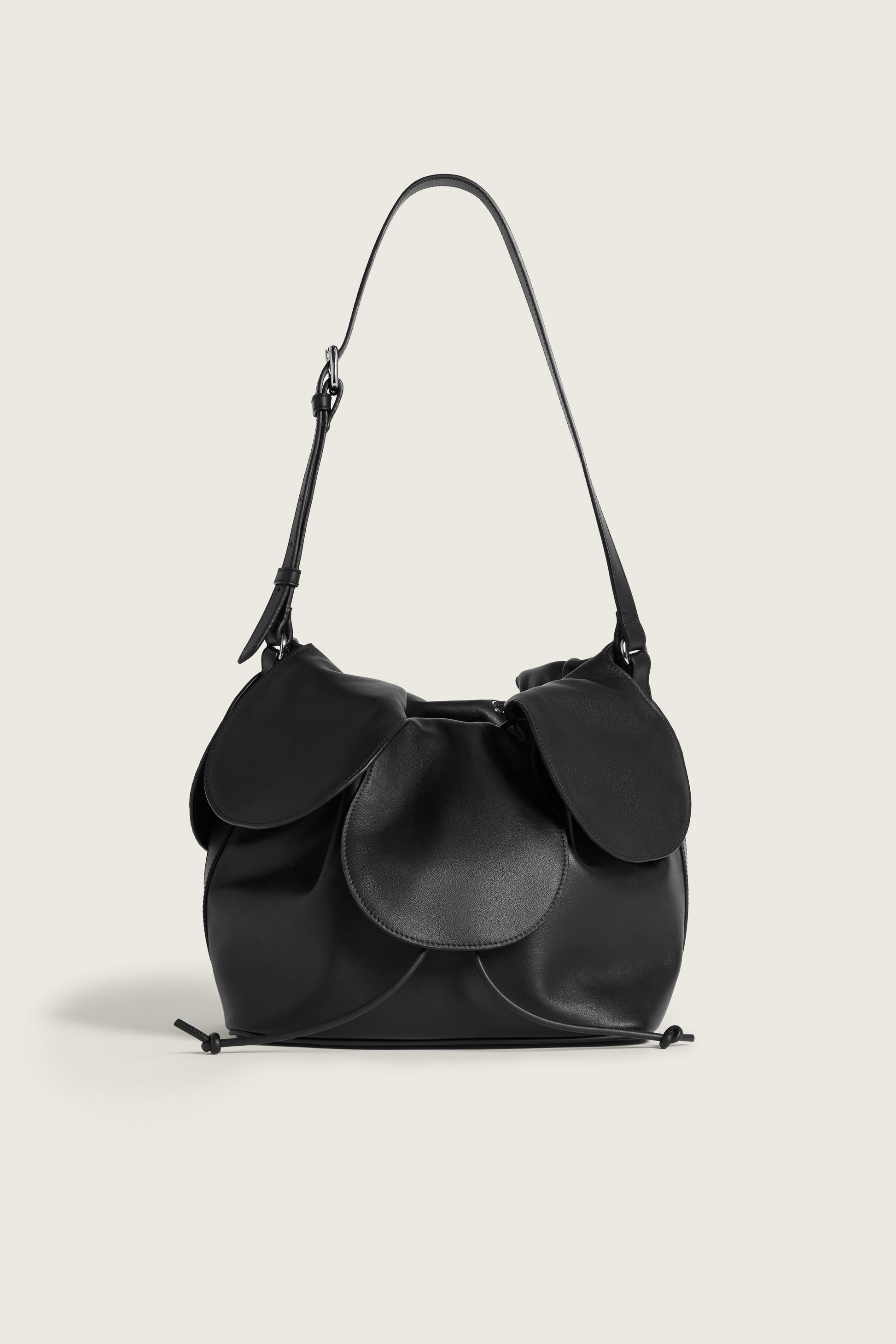 A leather bucket bag with petal shaped panels, it features an adjustable drawstring closure for a signature gathered look.