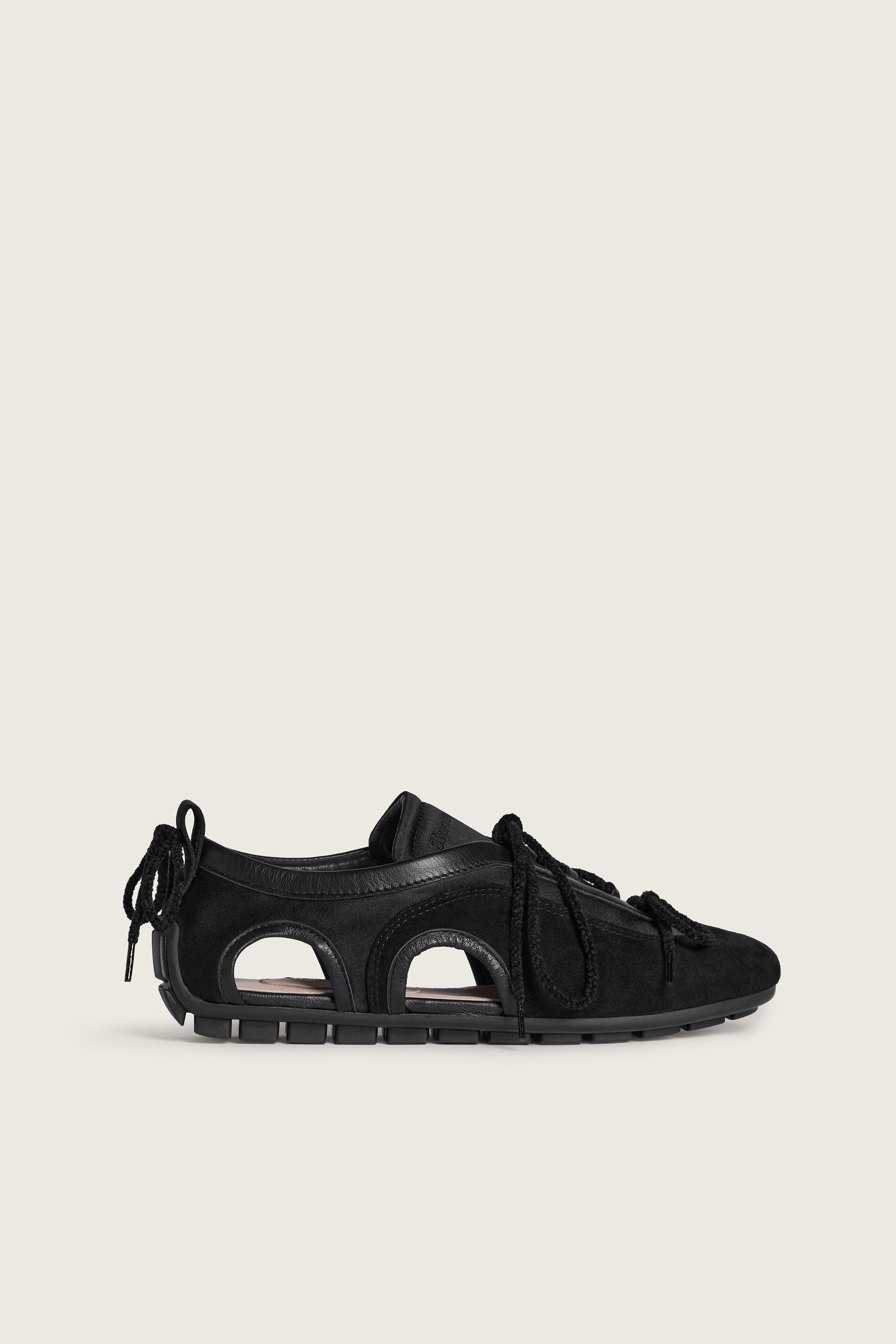 An update on the Simone Rocha ballerina trainer with satin and suede to the upper. The style is distinguished by multiple ribbow bow details and window cut-outs to the side.
