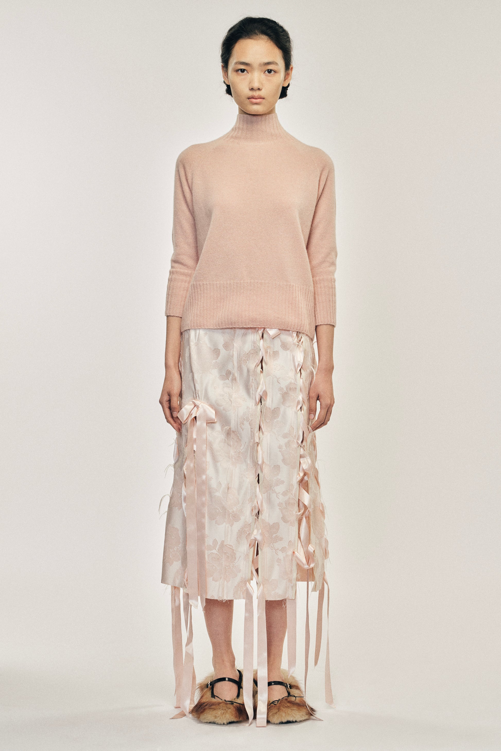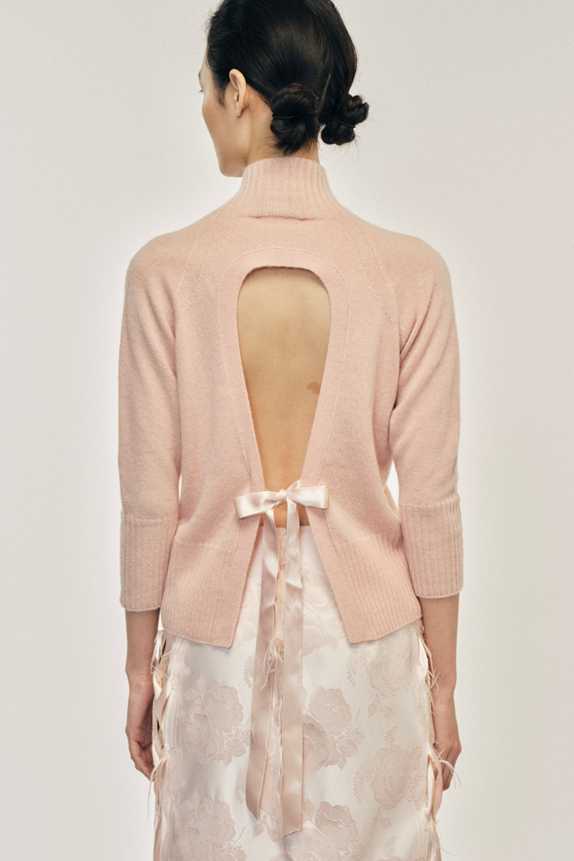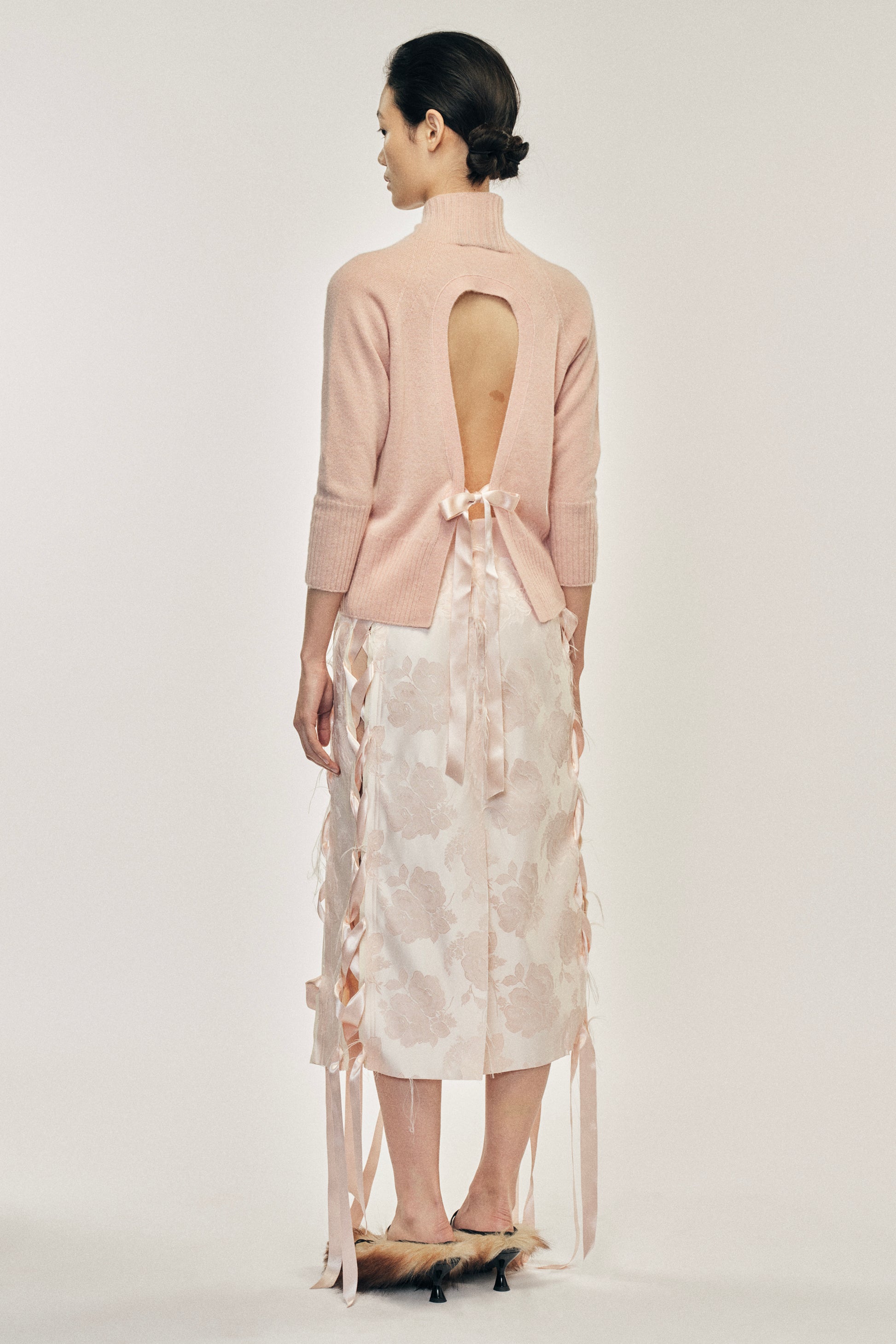 A high neck jumper in a new cashmere yarn, it features a cut out in the back that with a ribbon bow detail. The model is wearing this style with the Unraveling Ribbon Brocade Skirt.
