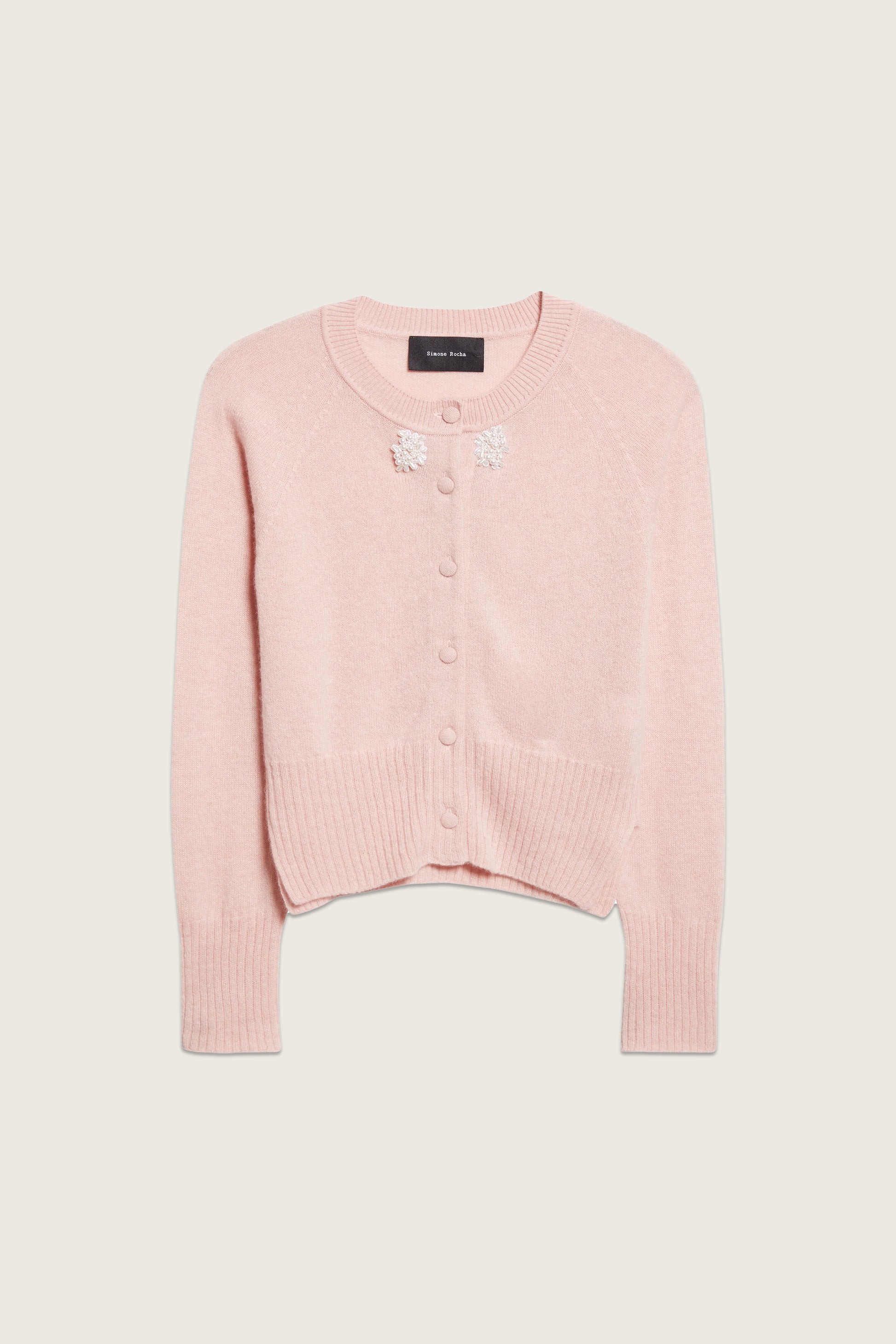 A subtly cropped cardigan knit from a new cashmere yarn, seasonal signature pearl cluster embellishments are featured at the front. The model is wearing this style with the Multi Slit Skirt.