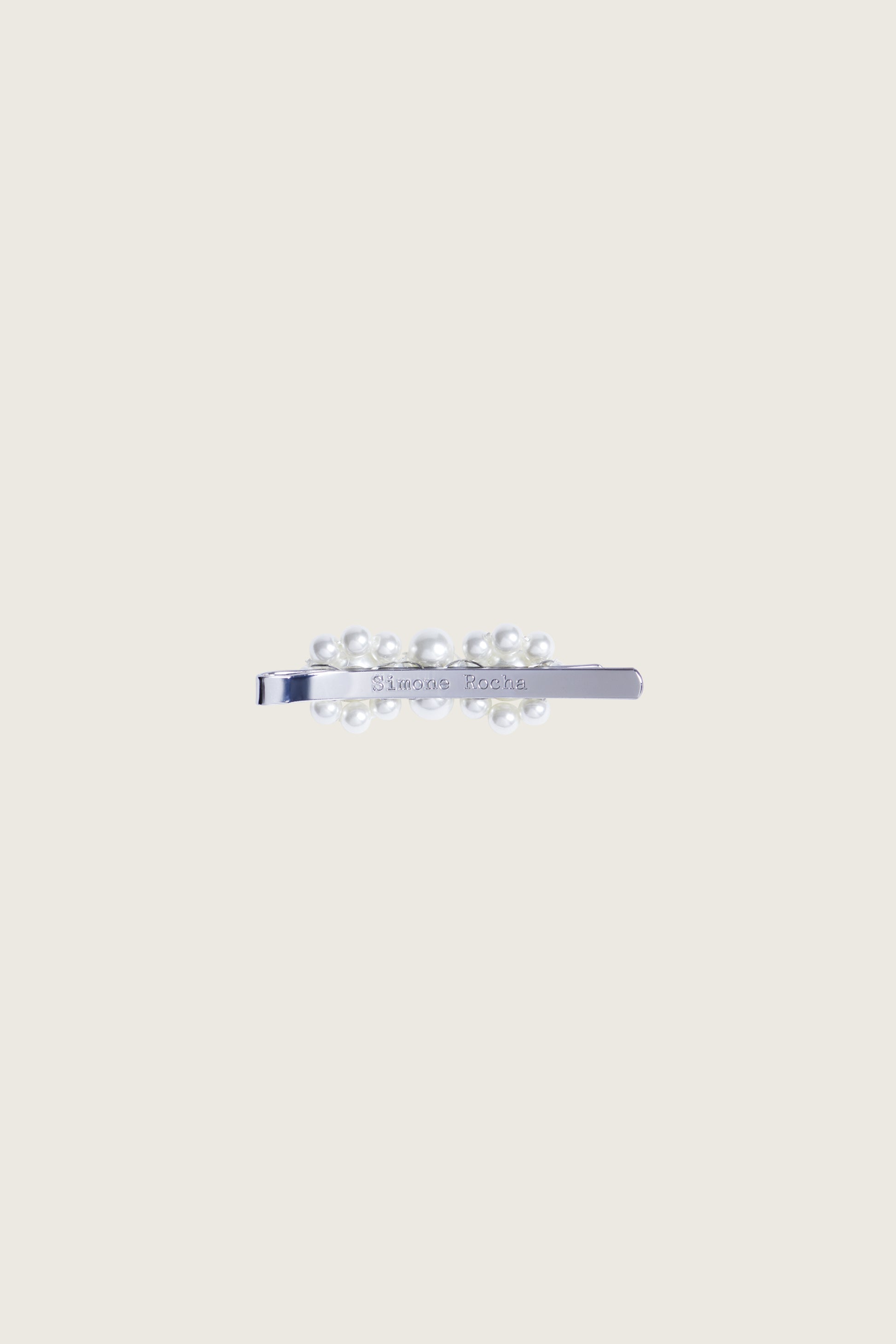 Simone Rocha’s mini crystal hair clip feature pearl beads made into floral clusters on a logo embossed slide.The mini size is a more playful addition to the brand’s classic pearl range.