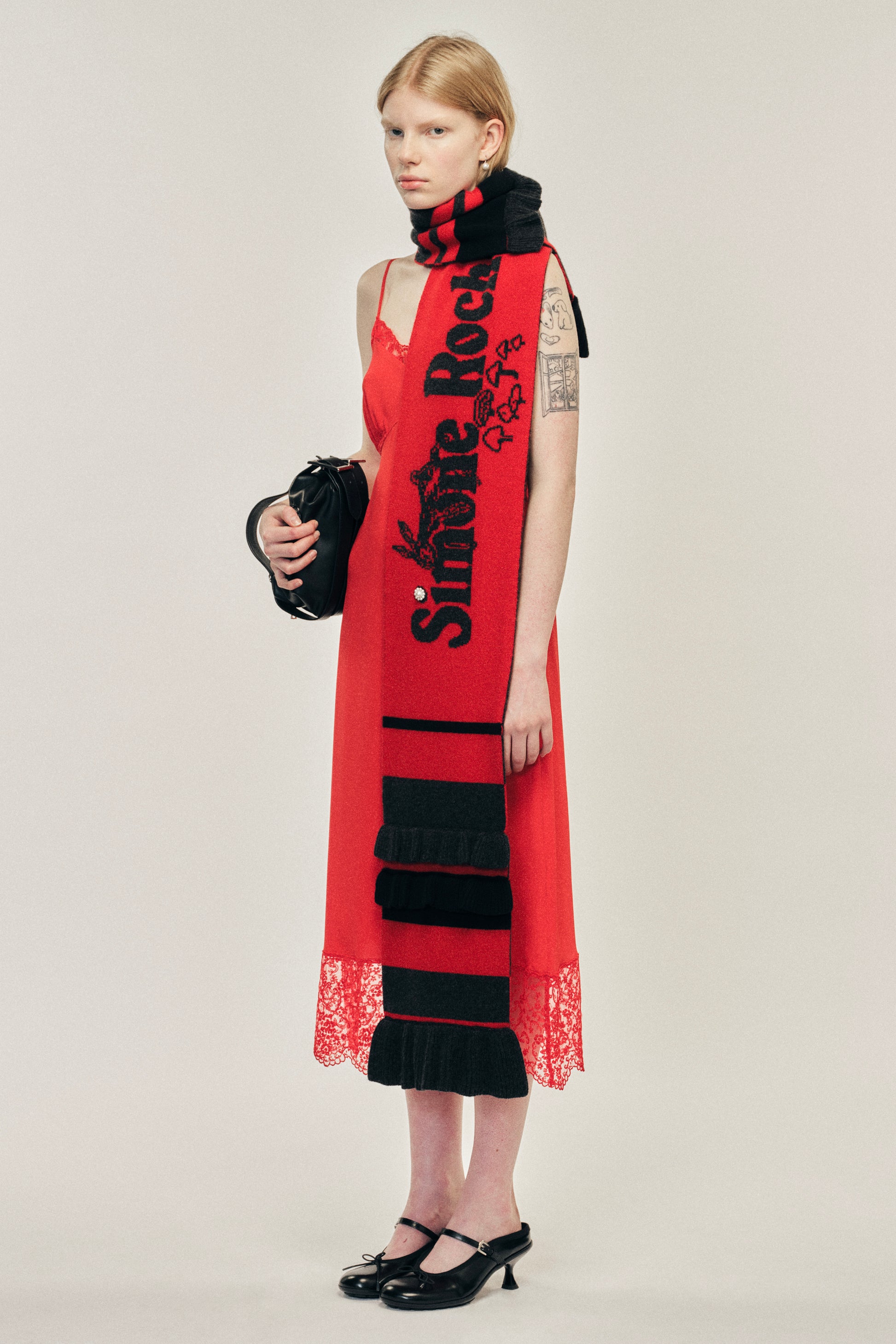 A merino wool and cashmere blend scarf featuring the Simone Rocha logo reinterpreted by artist Oscar Torrans. This multi-toned style also has the brand's signature ruffle detail throughout and a daisy embellishment.