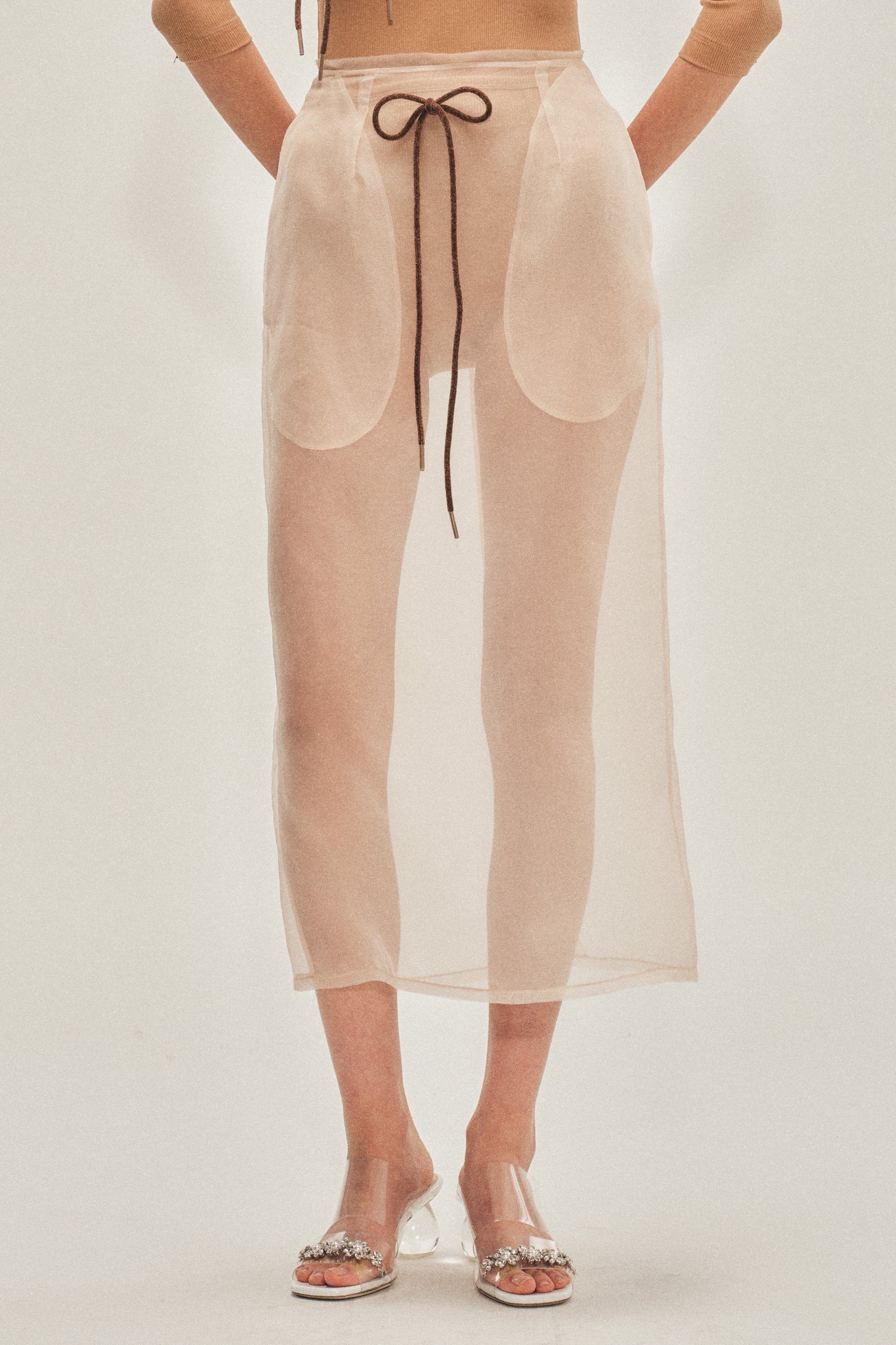 Clear jelly strap mules with a perspex drop heel, detailed with crystals and faux pearls at the toe. A nod to playful glamour and youthful whimsy.