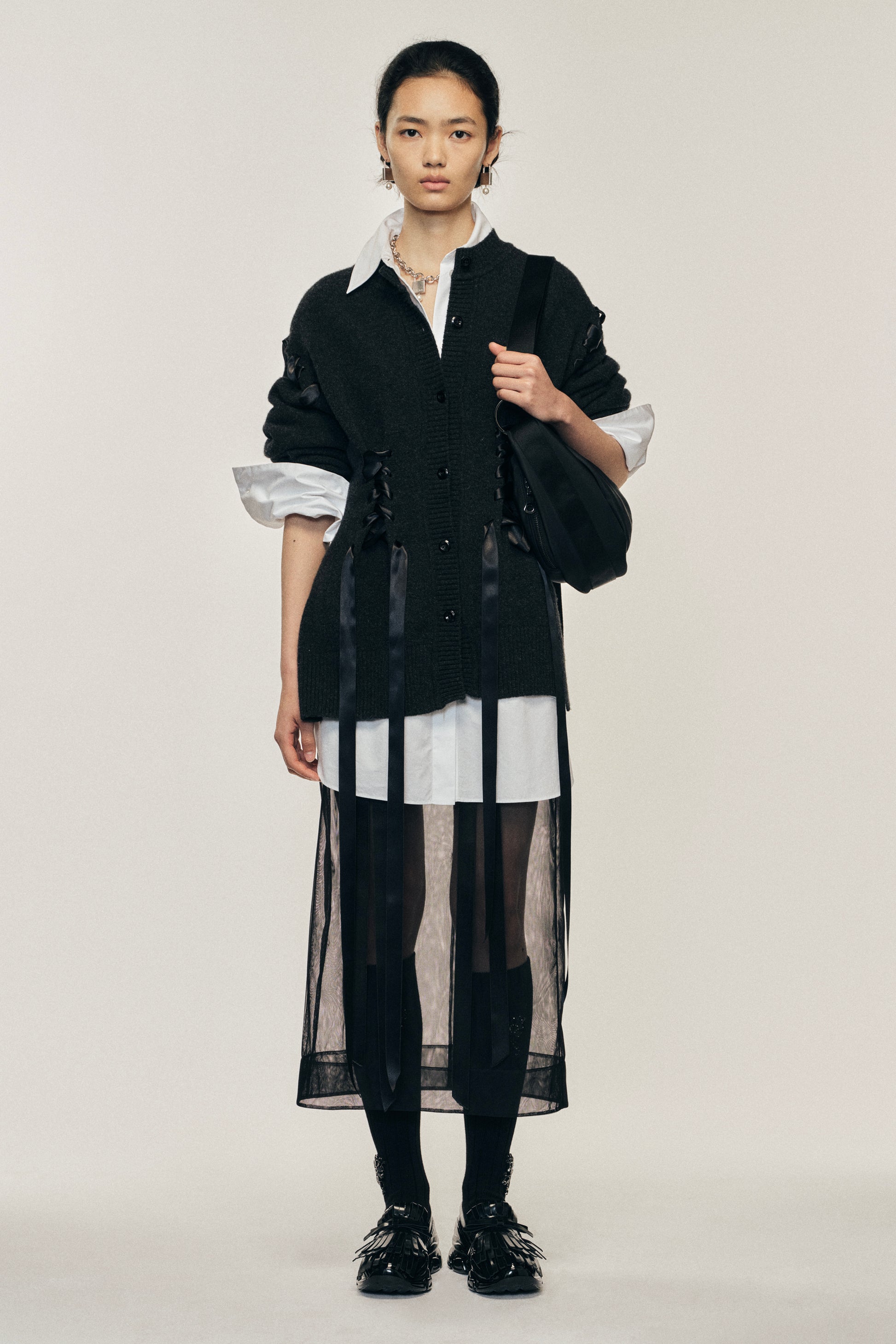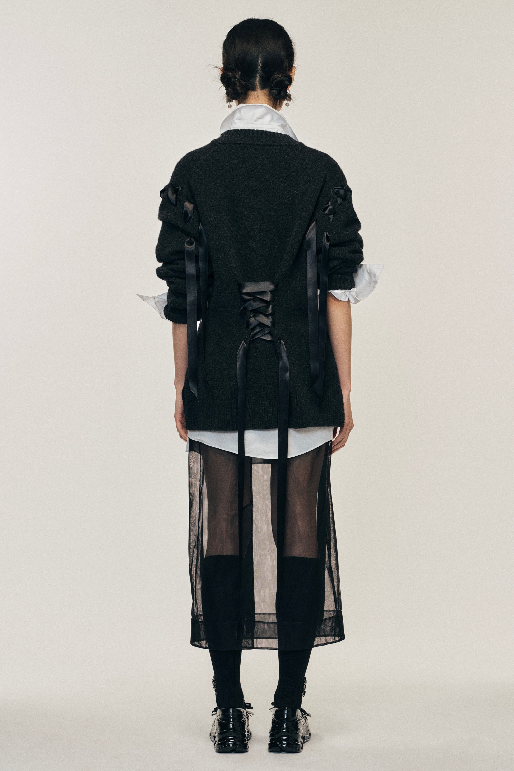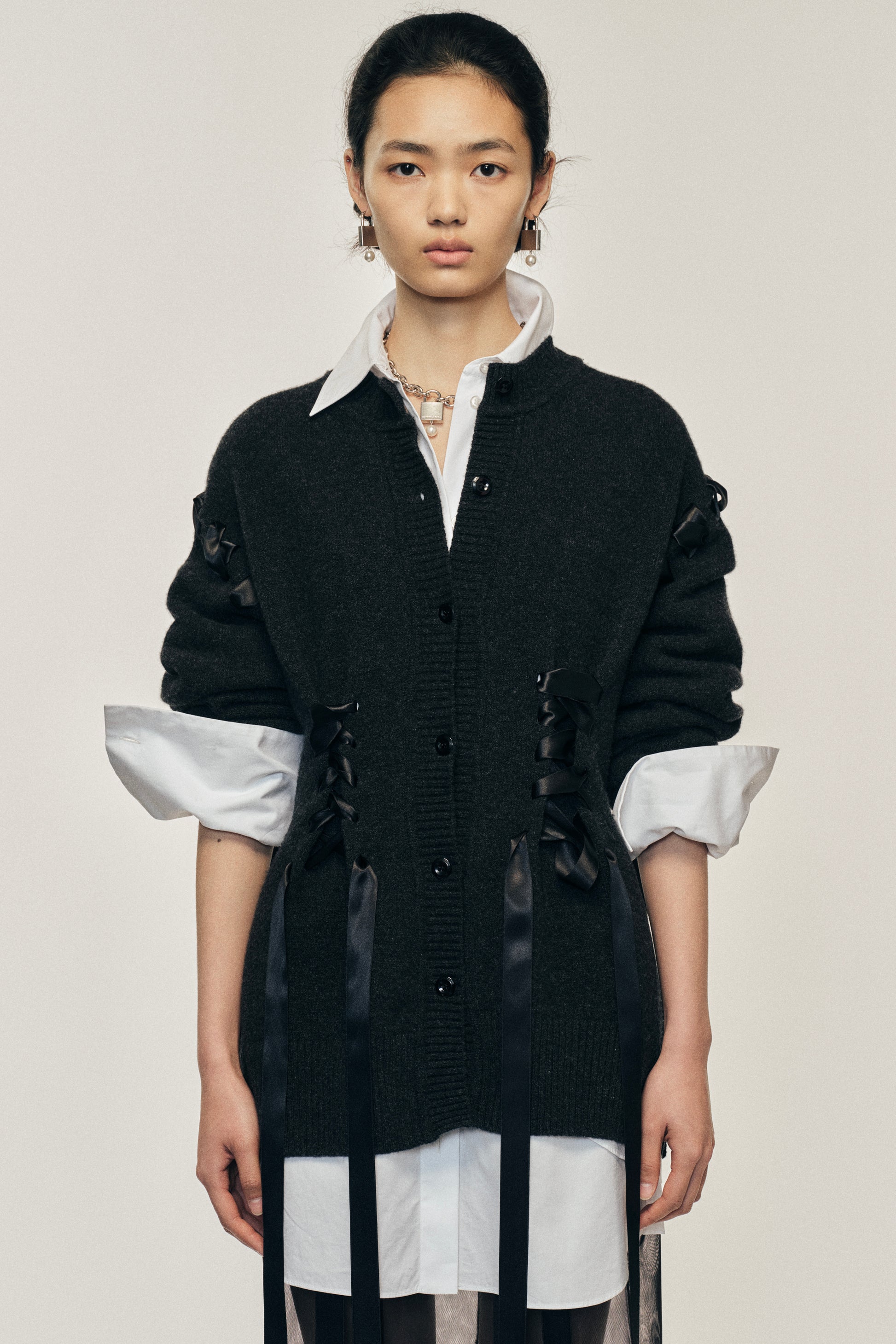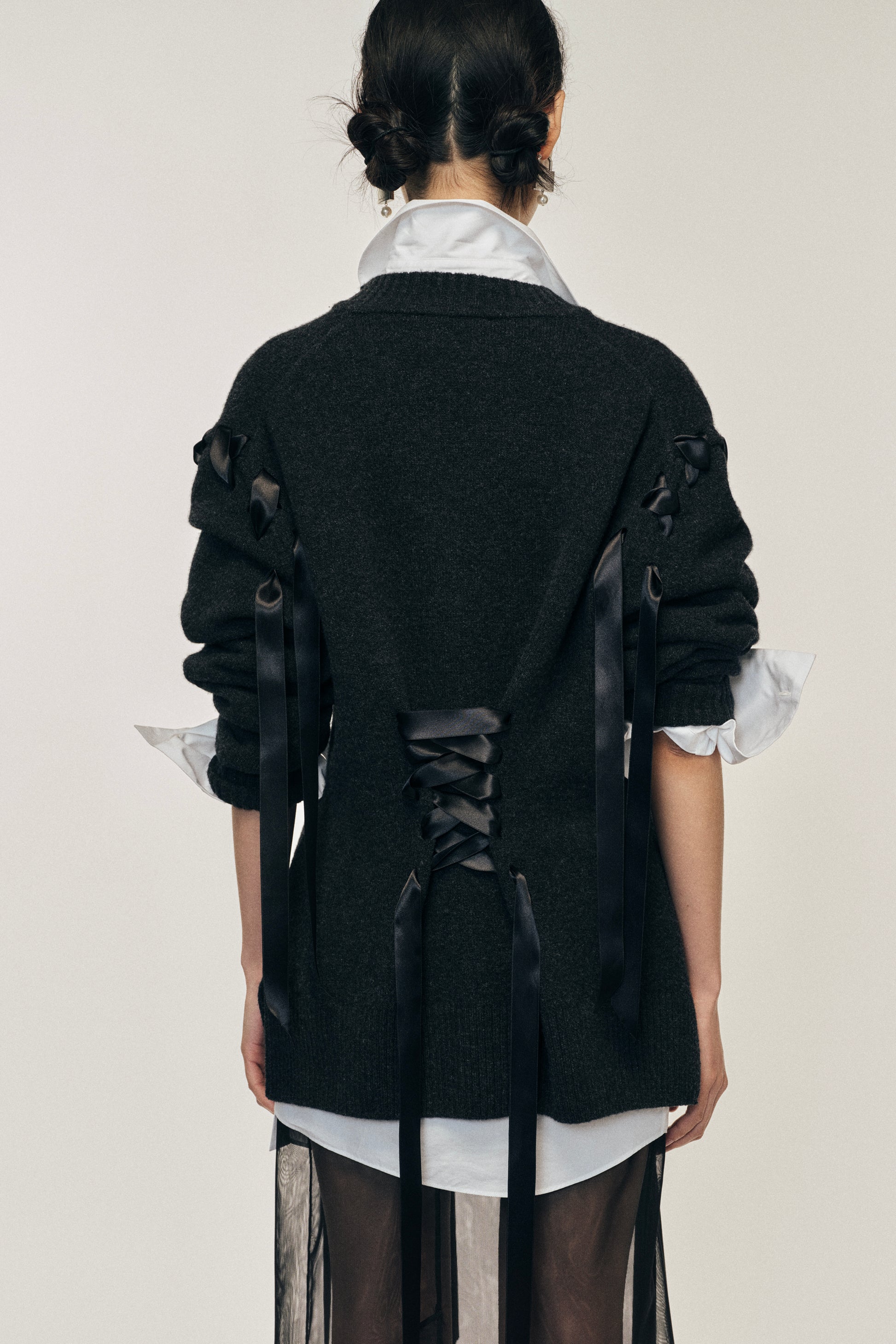 This cardigan features a corset-inspired design with satin ribbon details laced throughout. The voluminous sleeves and oversized silhouette creates a dramatic sculpted shape with the ribbon lacing. The model is wearing this style with the Elongated Cuff Button Placket Shirt & Sheer Bow Ribbon Pencil Skirt.