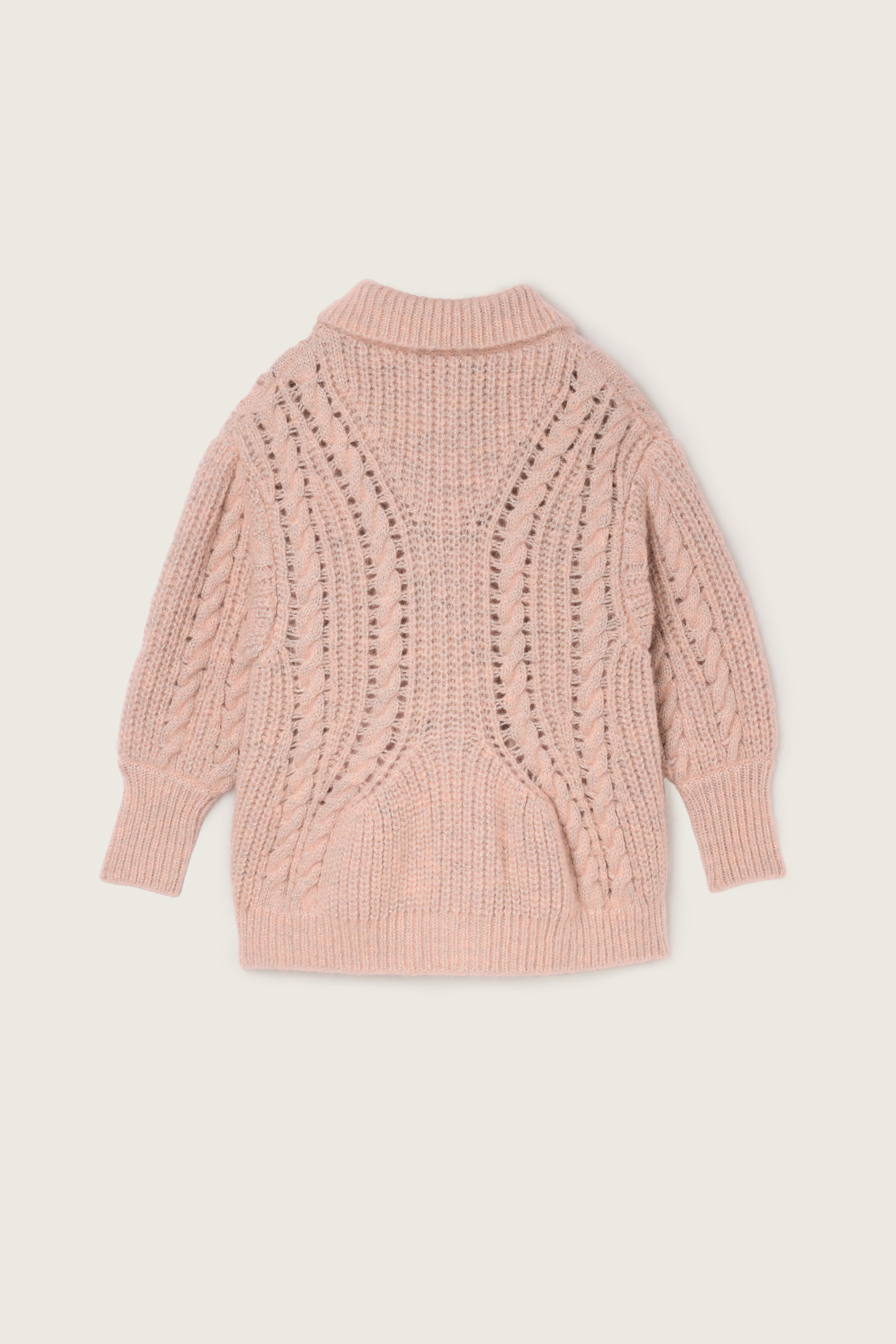 A collared cardigan knit from a chunky alpaca blend yarn with integrated tinsel, it features a sculpted shape with front pockets. This versatile piece can also be worn as a light jacket.