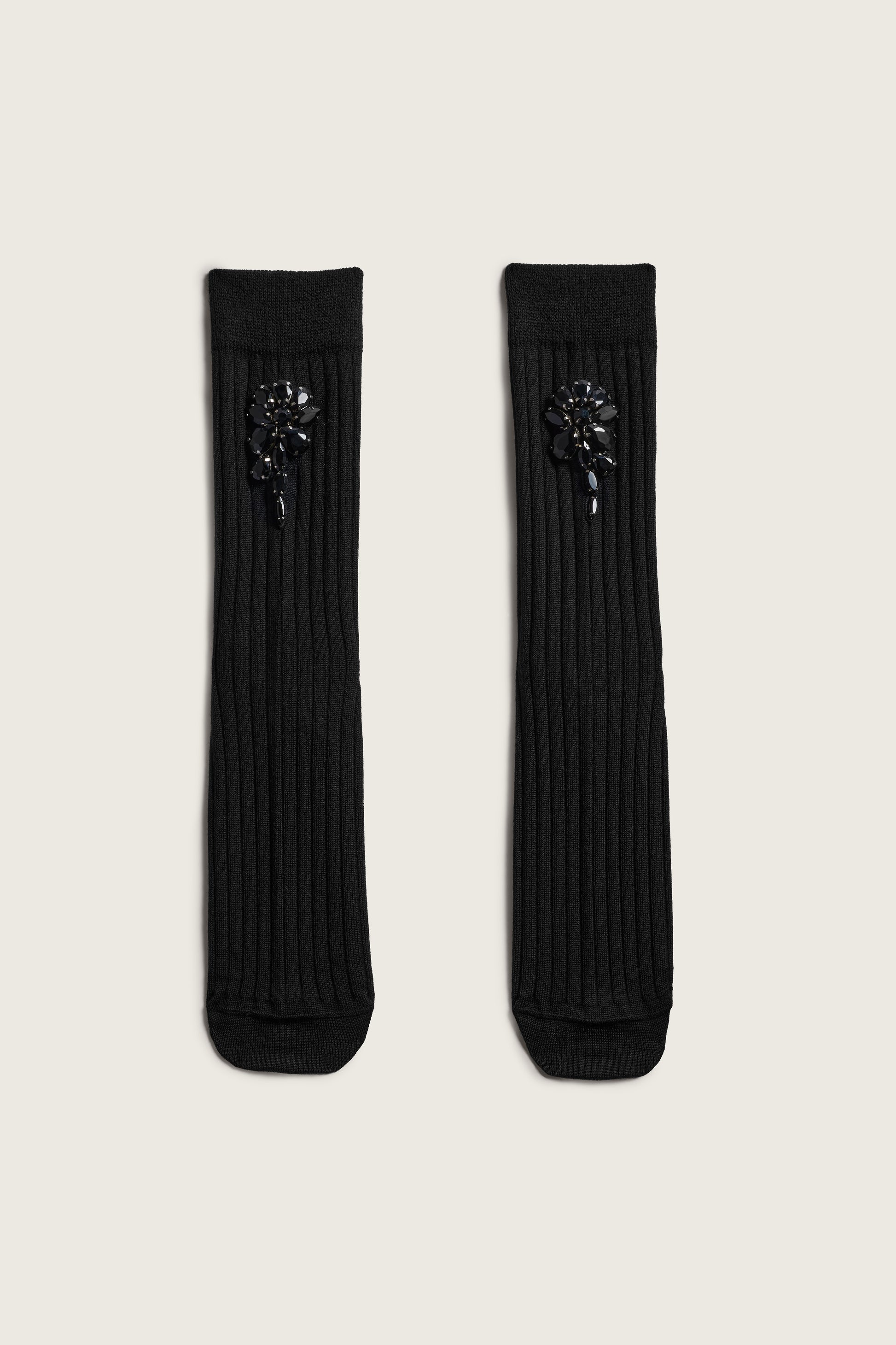 Ribbed ankle socks knitted from a luxurious merino and silk blend, completed with poppy crystal beading. Embellished socks have evolved into an essential Simone Rocha accessory.