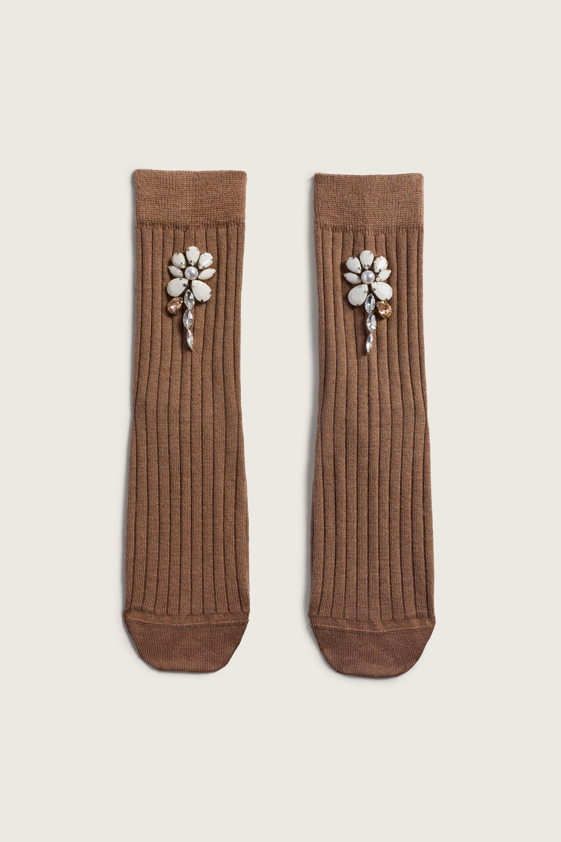 Ribbed ankle socks knitted from a luxurious merino and silk blend, completed with poppy crystal beading. Embellished socks have evolved into an essential Simone Rocha accessory.