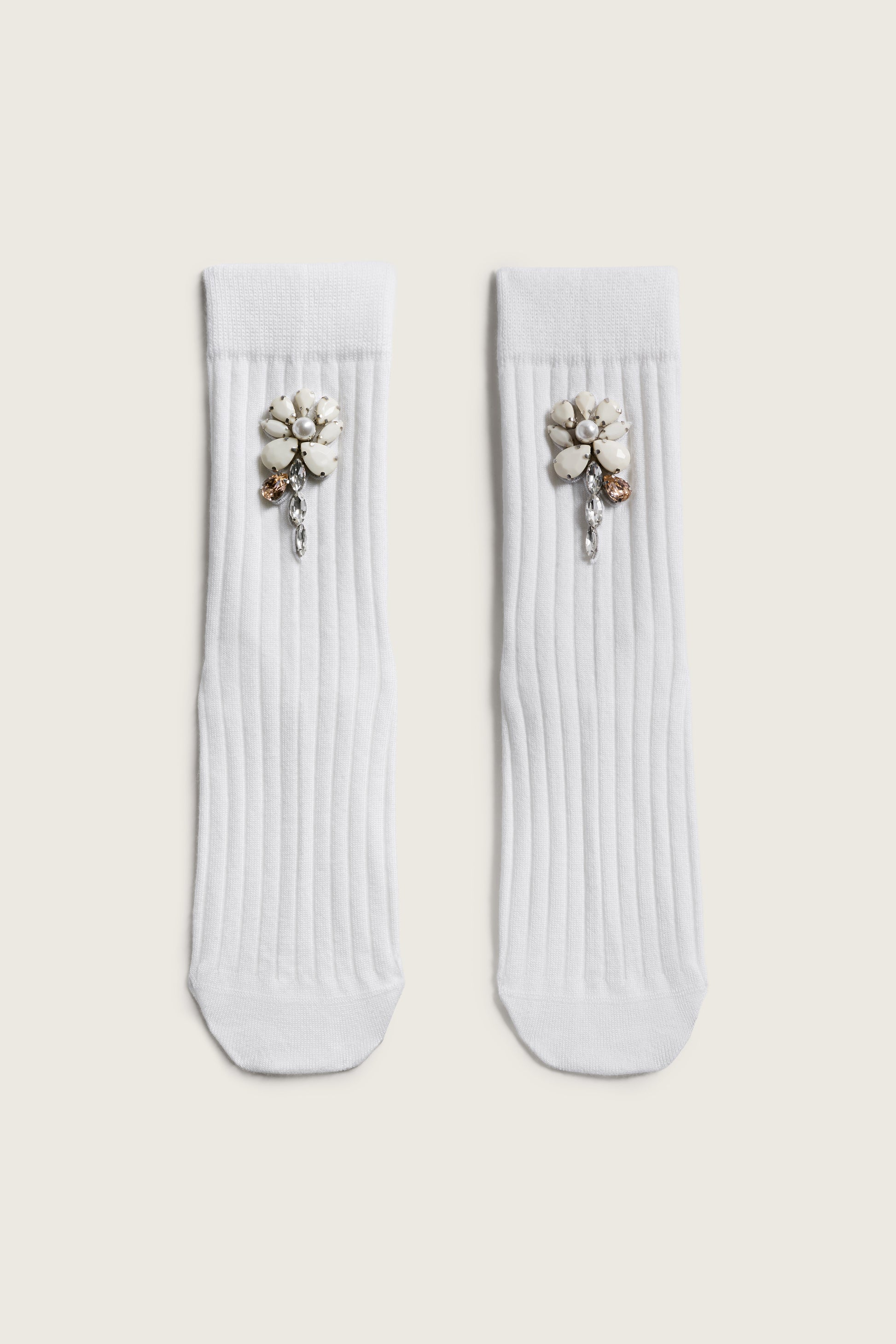 Ribbed ankle socks knitted from a luxurious merino and silk blend, completed with poppy crystal beading. Embellished socks have evolved into an essential Simone Rocha accessory.